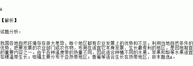 A ¡¾½âÎö¡¿ ÊÔÌâ·ÖÎö£º ÎÒ¹ú¸÷µØ×ÔÈ»»·¾³´æÔںܴó²îÒ죬ÿ¸öµØÇø¶¼ÓÐũҵ·¢Õ¹ÉϵÄÓÅÊÆºÍ²»×ã¡£ÀûÓõ±µØ×ÔÈ»Ìõ¼þµÄÓÅÊÆ£¬°ÑÒª·¢Õ¹µÄũҵ²¿ÃÅ»òÅ©×÷Î²¼¾ÖÔÚÊÊÒËËü±¾Éí·¢Õ¹¡¢Éú³¤×îÓÐÀûµÄµØÇø£¬ÊÇÒòµØÖÆÒ˵ÄÖØÒªÄÚÈÝÖ®Ò»¡£ÓÉÓÚ¸÷ÖÖζȴøµÄÈÈÁ¿²»Í¬£¬Òò´ËÊʺÏÖÖÖ²²»Í¬µÄË®¹û¡£Æ»¹ûºÍÀæµÈË®¹ûÊÊÒËÔÚůδøÉú³¤£»¸ÌéÙÖ÷Òª·Ö²¼ÓÚÑÇÈÈ´øµØÇø£»Ïã½¶µÈÊʺÏÉú³¤ÔÚÈÈ´øµØÇø£¬¹Ê±¾ÌâÑ¡A¡£