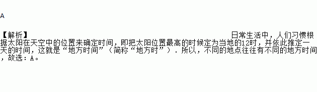 A 【解析】日常生活中,人们习惯根据太阳在天空中的位置来确定时间,即把太阳位置最高的时候定为当地的12时,并依此推定一天的时间,这就是“地方时间”(简称“地方时”).所以,不同的地点往往有不同的地方时间,故选:A。
