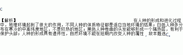 C ¡¾½âÎö¡¿ÔÚÈËÖÖµÄÐγɺͽø»¯¹ý³ÌÖУ¬µØÀí»·¾³Æðµ½Á˺ܴóµÄ×÷Ó㬲»Í¬ÈËÖÖµÄÌåÖÊÌØÕ÷¶¼ÊÇÊÊÓ¦µ±µØ»·¾³µÄ½á¹û£»°×É«ÈËÖÖ¶à·Ö²¼ÔÚº®ÀäµÄÖиßγ¶ÈµØÇø£¬²»ÊǽÏÈȵĵØÇø£»ºÚÉ«ÈËÖÖ¾íÇúµÄÍ··¢Äܹ»ÐγÉÒ»¸ö¸ôÈȲ㣬ÓÐÀûÓÚ±£»¤Í·²¿£»ÈËÖÖµÄÐγɾßÓÐÒÅ´«ÐÔ£¬×ÔÈ»»·¾³²»ÄÜÔÚ¶ÌÆÚÄڸıäÈËÖÖµÄÊôÐÔ£¬¹Ê±¾ÌâÑ¡C¡£