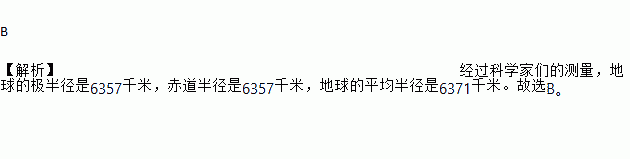 B 【解析】经过科学家们的测量,地球的极半径是6357千米,赤道半径是6357千米,地球的平均半径是6371千米。故选B。