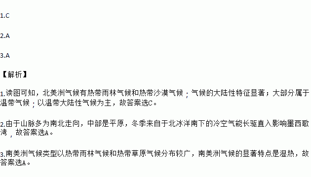 1.C 2.A 3.A ¡¾½âÎö¡¿ 1.¶Áͼ¿ÉÖª£¬±±ÃÀÖÞÆøºòÓÐÈÈ´øÓêÁÖÆøºòºÍÈÈ´øÉ³Ä®Æøºò£»ÆøºòµÄ´ó½ÐÔÌØÕ÷ÏÔÖø£»´ó²¿·ÖÊôÓÚδøÆøºò£»ÒÔδø´ó½ÐÔÆøºòΪÖ÷£¬¹Ê´ð°¸Ñ¡C¡£ 2.ÓÉÓÚɽÂö¶àΪÄϱ±×ßÏò£¬Öв¿ÊÇÆ½Ô£¬¶¬¼¾À´×ÔÓÚ±±±ùÑóÄÏϵÄÀä¿ÕÆøÄܳ¤ÇýÖ±ÈëÓ°ÏìÄ«Î÷¸èÍ壬¹Ê´ð°¸Ñ¡A¡£ 3.ÄÏÃÀÖÞÆøºòÀàÐÍÒÔÈÈ´øÓêÁÖÆøºòºÍÈÈ´ø²ÝÔÆøºò·Ö²¼½Ï¹ã£¬ÄÏÃÀÖÞÆøºòµÄÏÔÖøÌØµãÊÇʪÈÈ£¬¹Ê´ð°¸Ñ¡A...
