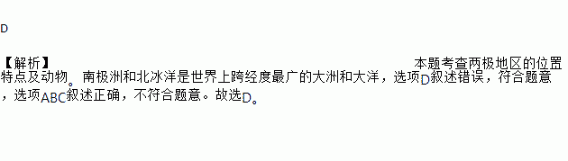 D 【解析】本题考查两极地区的位置特点及动物。南极洲和北冰洋是世界上跨经度最广的大洲和大洋,选项D叙述错误,符合题意,选项ABC叙述正确,不符合题意。故选D。