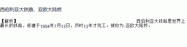 西伯利亚大铁路、亚欧大陆桥 【解析】西伯利亚大铁路是世界上最长的铁路,修建于1904年7月13日,历时13年才完工。被称为-亚欧大陆桥。