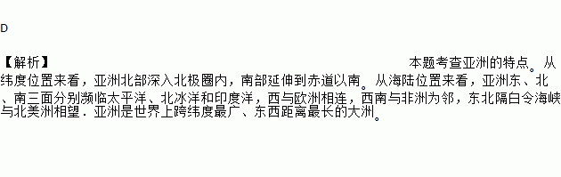 D ¡¾½âÎö¡¿±¾Ì⿼²éÑÇÖÞµÄÌØµã¡£´Óγ¶ÈλÖÃÀ´¿´£¬ÑÇÖÞ±±²¿ÉîÈë±±¼«È¦ÄÚ£¬Äϲ¿ÑÓÉìµ½³àµÀÒÔÄÏ¡£´Óº£Â½Î»ÖÃÀ´¿´£¬ÑÇÖÞ¶«¡¢±±¡¢ÄÏÈýÃæ·Ö±ð±ôÁÙ̫ƽÑó¡¢±±±ùÑóºÍÓ¡¶ÈÑó£¬Î÷ÓëÅ·ÖÞÏàÁ¬£¬Î÷ÄÏÓë·ÇÖÞΪÁÚ£¬¶«±±¸ô°×ÁϿÓë±±ÃÀÖÞÏàÍû£®ÑÇÖÞÊÇÊÀ½çÉÏ¿çγ¶È×î¹ã¡¢¶«Î÷¾àÀë×µÄ´óÖÞ¡£