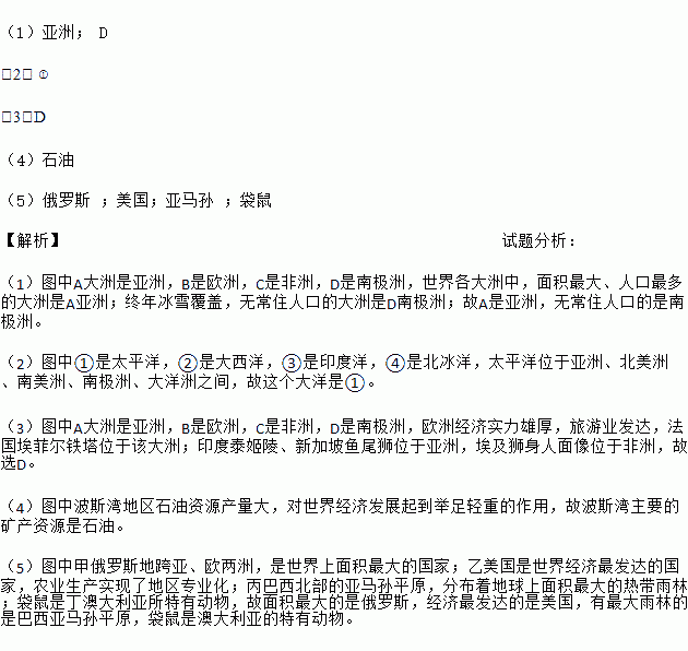 (4)图中波斯湾地区 (矿产资源)产量大,对世界经济发展起到举足轻重的作用.