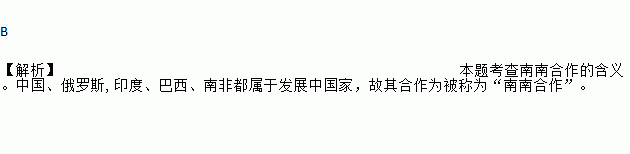 B 【解析】本题考查南南合作的含义。中国、俄罗斯,印度、巴西、南非都属于发展中国家,故其合作为被称为“南南合作”。