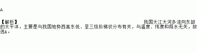 A 【解析】我国大江大河多流向东部的太平洋,主要是与我国地势西高东低、呈三级阶梯状分布有关,与温度、纬度和降水无关,故选A。