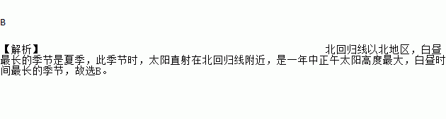 B 【解析】北回归线以北地区,白昼最长的季节是夏季,此季节时,太阳直射在北回归线附近,是一年中正午太阳高度最大,白昼时间最长的季节,故选B。
