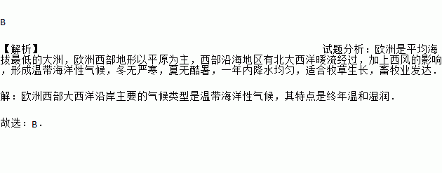 B ¡¾½âÎö¡¿ÊÔÌâ·ÖÎö£ºÅ·ÖÞÊÇÆ½¾ùº£°Î×îµÍµÄ´óÖÞ£¬Å·ÖÞÎ÷²¿µØÐÎÒÔÆ½ÔΪÖ÷£¬Î÷²¿Ñغ£µØÇøÓб±´óÎ÷ÑóůÁ÷¾¹ý£¬¼ÓÉÏÎ÷·çµÄÓ°Ï죬ÐγÉδøº£ÑóÐÔÆøºò£¬¶¬ÎÞÑϺ®£¬ÏÄÎÞ¿áÊһÄêÄÚ½µË®¾ùÔÈ£¬ÊʺÏÄÁ²ÝÉú³¤£¬ÐóÄÁÒµ·¢´ï£® ¡¾½âÎö¡¿ Å·ÖÞÎ÷²¿´óÎ÷ÑóÑØ°¶Ö÷ÒªµÄÆøºòÀàÐÍÊÇδøº£ÑóÐÔÆøºò£¬ÆäÌØµãÊÇÖÕÄêκÍʪÈó£® ¹ÊÑ¡£ºB£®