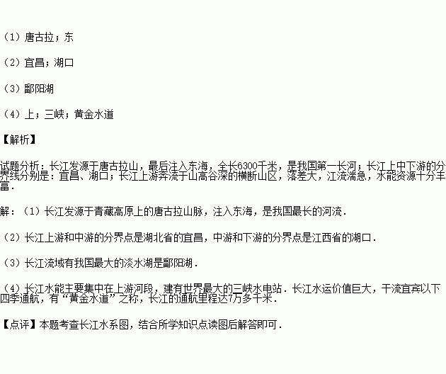 (2)长江上游和中游的分界点是 ,中游和下游的分界点是 .
