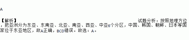 A 【解析】试题分析:按照地理方位,把亚洲分为东亚、东南亚、北亚、南亚、西亚、中亚6个分区,中国、韩国、朝鲜、日本等国家位于东亚地区,故A正确,BCD错误。故选:A。