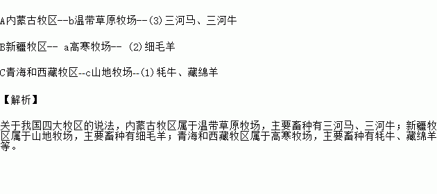 C青海和西藏牧区 | ________ | c山地牧场 | ③三河马、三河牛 |