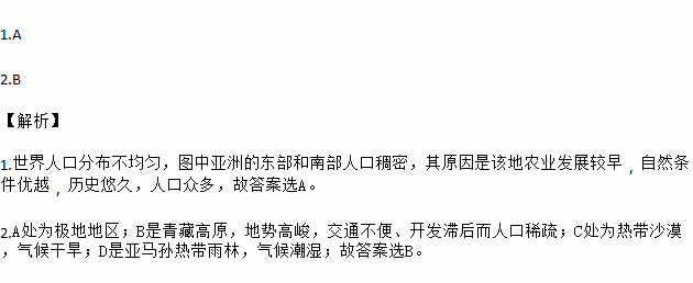 1.A 2.B 【解析】 1.世界人口分布不均匀,图中亚洲的东部和南部人口稠密,其原因是该地农业发展较早,自然条件优越,历史悠久,人口众多,故答案选A。 2.A处为极地地区;B是青藏高原,地势高峻,交通不便、开发滞后而人口稀疏;C处为热带沙漠,气候干旱;D是亚马孙热带雨林,气候潮湿;故答案选B。