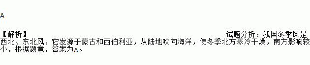 A 【解析】试题分析:我国冬季风是西北、东北风,它发源于蒙古和西伯利亚,从陆地吹向海洋,使冬季北方寒冷干燥,南方影响较小,根据题意,答案为A。