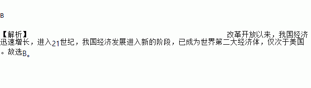 B 【解析】改革开放以来,我国经济迅速增长,进入21世纪,我国经济发展进入新的阶段,已成为世界第二大经济体,仅次于美国。故选B。