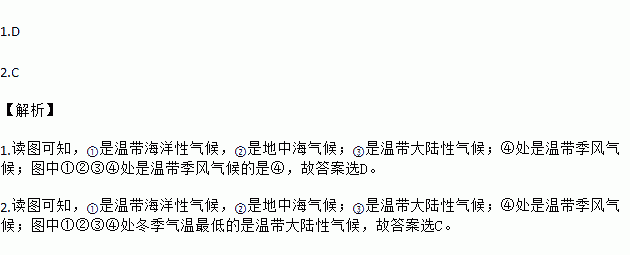 1.D 2.C 【解析】 1.读图可知,①是温带海洋性气候,②是地中海气候;③是温带大陆性气候;④处是温带季风气候;图中①②③④处是温带季风气候的是④,故答案选D。 2.读图可知,①是温带海洋性气候,②是地中海气候;③是温带大陆性气候;④处是温带季风气候;图中①②③④处冬季气温最低的是温带大陆性气候,故答案选C。