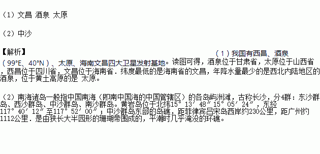 (1)在我国四大卫星发射中心中,纬度最低的是,年降水量最少的是,位于黄土高原的是。