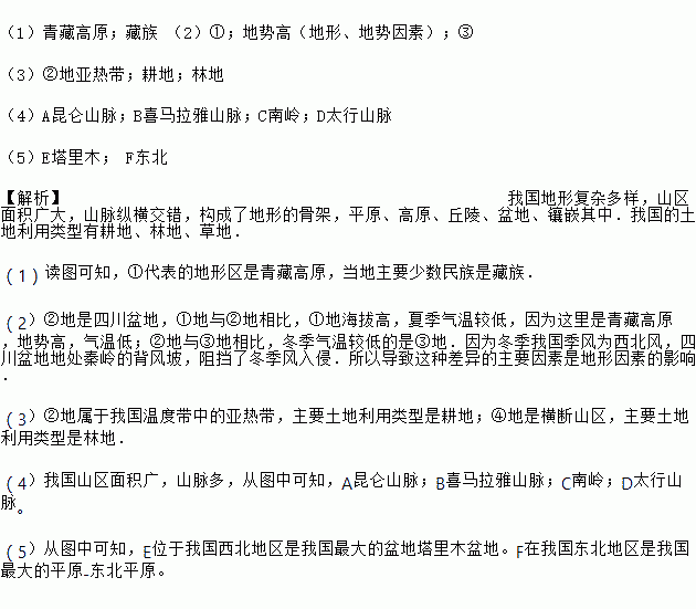 (1)青藏高原;藏族 (2)①;地势高(地形、地势因素);③ (3)②地亚热带;耕地;林地 (4)A昆仑山脉;B喜马拉雅山脉;C南岭;D太行山脉 (5)E塔里木; F东北 【解析】我国地形复杂多样,山区面积广大,山脉纵横交错,构成了地形的骨架,平原、高原、丘陵、盆地、镶嵌其中.我国的土地利用类型有耕地、林地、草地. (1)读图可知,①代表的地形区是青藏高原,当地主要少...
