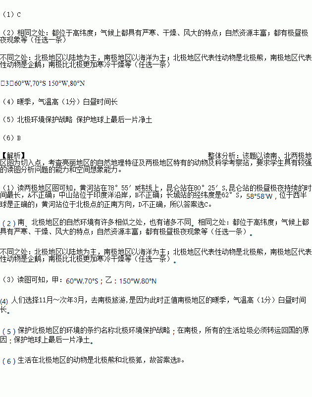 (2)南、北极地区的自然环境有许多相似之处,也有诸多不同。请各举一例说明。