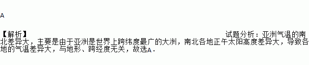 A 【解析】试题分析:亚洲气温的南北差异大,主要是由于亚洲是世界上跨纬度最广的大洲,南北各地正午太阳高度差异大,导致各地的气温差异大,与地形、跨经度无关,故选A.