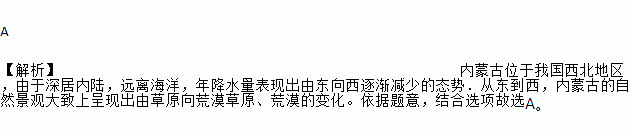 A 【解析】内蒙古位于我国西北地区,由于深居内陆,远离海洋,年降水量表现出由东向西逐渐减少的态势.从东到西,内蒙古的自然景观大致上呈现出由草原向荒漠草原、荒漠的变化。依据题意,结合选项故选A。