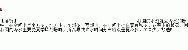 B 【解析】我国的水资源受降水的影响,在空间上是南方多、北方少,东部多、西部少,在时间上存在着夏秋多、冬春少的状况,因我国的降水主要受夏季风的影响,所以导致降水时间分布特点是夏秋多,冬春少,故选B.