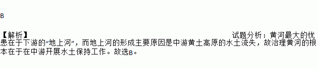 B 【解析】试题分析:黄河最大的忧患在于下游的“地上河”,而地上河的形成主要原因是中游黄土高原的水土流失,故治理黄河的根本在于在中游开展水土保持工作。故选B。