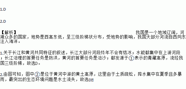 1.D 2.D 【解析】我国是一个地域辽阔,河湖众多的国家,地势是西高东低,呈三级阶梯状分布,受地势的影响,我国大部分河流自西向东注入海洋。 1.关于长江和黄河共同特征的叙述,长江大部分河段终年不会有结冰;水能都集中在上游河段;长江治理的首要任务是防洪,黄河的首要任务是治沙;都发源于①表示的青藏高原,流经我国三级阶梯,故选D。 2.由图可知,图中②是位于黄河中游的黄土高原,...