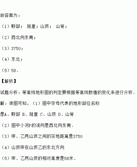 ¹Ê´ð°¸Îª£º £¨1£©°°²¿£» ¶¸Ñ£»É½¶¥£» ɽ¼¹£» £¨2£©Î÷±±Ïò¶«ÄÏ£» £¨3£©3750£» £¨4£©¶«±±£» £¨5£©58£® ¡¾½âÎö¡¿ ÊÔÌâ·ÖÎö£ºµÈ¸ßÏßµØÐÎͼµÄÅж¨Òª¸ù¾ÝµÈ¸ßÏßÊýÖµµÄ±ä»¯À´½øÐзÖÎö£® ¡¾½âÎö¡¿ ¶Áͼ¿ÉÖª£¬£¨1£©Í¼ÖÐ×Öĸ´ú±íµÄµØÐβ¿Î»Ãû³Æ ÊÇA¡¢°°²¿ B¡¢¶¸Ñ C¡¢É½¶¥ D¡¢É½¼¹ £¨2£©Í¼ÖÐСºÓFµÄÁ÷ÏòÊÇÎ÷±±Ïò¶«ÄÏ£® £¨3£©¼×¡¢...