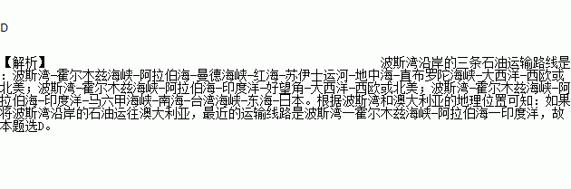 如果将波斯湾沿岸的石油运往澳大利亚,最近的运输线路是 ( )
