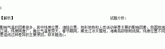 春节期间,黑龙江冰天雪地,海南岛却绿树成荫。形成两地景色差异的原因是
