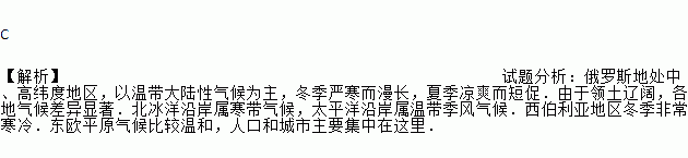 C 【解析】试题分析:俄罗斯地处中、高纬度地区,以温带大陆性气候为主,冬季严寒而漫长,夏季凉爽而短促.由于领土辽阔,各地气候差异显著.北冰洋沿岸属寒带气候,太平洋沿岸属温带季风气候.西伯利亚地区冬季非常寒冷.东欧平原气候比较温和,人口和城市主要集中在这里.