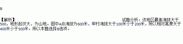 如图为“某地区等高线图”,读图判定该地区的地形类型以及A点和甲村的相对高度分别是( )