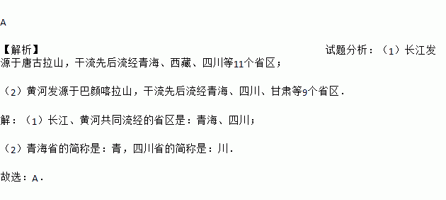 A 【解析】试题分析:(1)长江发源于唐古拉山,干流先后流经青海、西藏、四川等11个省区; (2)黄河发源于巴颜喀拉山,干流先后流经青海、四川、甘肃等9个省区. 【解析】 (1)长江、黄河共同流经的省区是:青海、四川; (2)青海省的简称是:青,四川省的简称是:川. 故选:A.