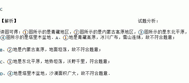C 【解析】试题分析: 读图可得:①图所示的是青藏地区,②图所示的是内蒙古高原地区,③图所示的是东北平原,④图所示的是塔里木盆地.A、①地是青藏高原,冰川广布,雪山连绵,故不符合题意; B、②地是内蒙古高原,地面坦荡,故不符合题意; C、③地是东北平原,地势坦荡,沃野千里,符合题意; D、④地是塔里木盆地,沙漠面积广大,故不符合题意.