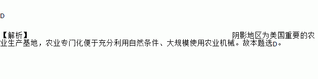D 【解析】阴影地区为美国重要的农业生产基地,农业专门化便于充分利用自然条件、大规模使用农业机械。故本题选D。