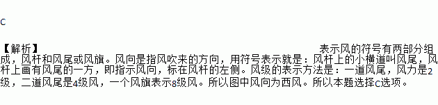 C 【解析】表示风的符号有两部分组成,风杆和风尾或风旗。风向是指风吹来的方向,用符号表示就是:风杆上的小横道叫风尾,风杆上画有风尾的一方,即指示风向,标在风杆的左侧。风级的表示方法是:一道风尾,风力是2级,二道风尾是4级风,一个风旗表示8级风。所以图中风向为西风。所以本题选择C选项。