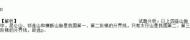D 【解析】试题分析:以上四座山脉中,昆仑山、祁连山和横断山脉是我国第一、第二阶梯的分界线,只有太行山是我国第二、第三阶梯的分界线,故选D.