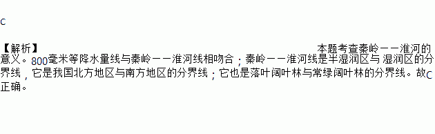 C ¡¾½âÎö¡¿±¾Ì⿼²éÇØÁ롪¡ª»´ºÓµÄÒâÒå¡£800ºÁÃ׵ȽµË®Á¿ÏßÓëÇØÁ롪¡ª»´ºÓÏßÏàÎǺϣ»ÇØÁ롪¡ª»´ºÓÏßÊǰëʪÈóÇøÓë ʪÈóÇøµÄ·Ö½çÏߣ¬ËüÊÇÎÒ¹ú±±·½µØÇøÓëÄÏ·½µØÇøµÄ·Ö½çÏߣ»ËüÒ²ÊÇÂäÒ¶À«Ò¶ÁÖÓë³£ÂÌÀ«Ò¶ÁֵķֽçÏß¡£¹ÊCÕýÈ·¡£