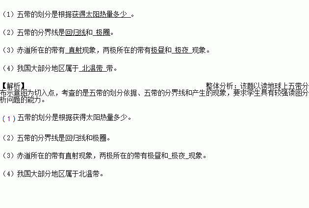 在左下图中适当的位置上填写五带的名称并回答下列问题。