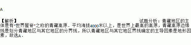 A 【解析】试题分析:青藏地区的主体是有“世界屋脊”之称的青藏高原.平均海拔4000米以上,是世界上最高的高原,青藏高原边缘线是划分青藏地区与其它地区的分界线,所以青藏地区与其它地区界线确定的主导因素是地形因素,故选A.