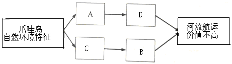 £¨2£©¸ßÌúµÄ½¨ÉèÃÖ²¹ÁËצÍÛµººÓÔ˵IJ»×㣮½«ÏÂÁдú±íµØÀíÏÖÏóµÄ×ÖĸÌîÈëÏàÓ¦¿Õ¸ñÄÚ£¬Íê³ÉצÍÛµººÓÁ÷º½Ô˼ÛÖµ²»¸ßµÄÔÒòʾÒâͼ£®