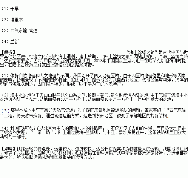 (3)盆地中蕴藏着丰富的油气资源,为了缓解东部地区能源紧缺的问题,国家实施了“_________”工程,将天然气资源,通过_________运输方式,运送到东部地区。