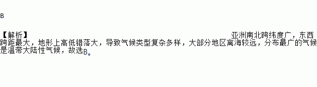 B 【解析】亚洲南北跨纬度广,东西跨距最大,地形上高低错落大,导致气候类型复杂多样,大部分地区离海较远,分布最广的气候是温带大陆性气候,故选B。