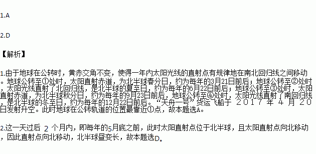 1.“天舟一号”货运飞船发射时,地球在公转轨道的位置最靠近( )
