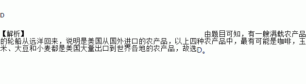 D 【解析】由题目可知,有一艘满载农产品的轮船从远洋回来,说明是美国从国外进口的农产品,以上四种农产品中,最有可能是咖啡,玉米、大豆和小麦都是美国大量出口到世界各地的农产品,故选D。