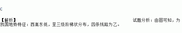 C 【解析】试题分析:由图可知,为我国地势特征:西高东低,呈三级阶梯状分布,四条线路为乙。