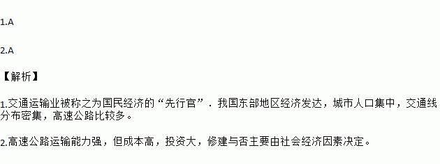 1.A 2.A ¡¾½âÎö¡¿ 1.½»Í¨ÔËÊäÒµ±»³ÆÖ®Îª¹úÃñ¾¼ÃµÄ¡°ÏÈÐй١±£®ÎÒ¹ú¶«²¿µØÇø¾¼Ã·¢´ï£¬³ÇÊÐÈ˿ڼ¯ÖУ¬½»Í¨Ïß·Ö²¼Ãܼ¯£¬¸ßËÙ¹«Â·±È½Ï¶à¡£ 2.¸ßËÙ¹«Â·ÔËÊäÄÜÁ¦Ç¿£¬µ«³É±¾¸ß£¬Í¶×Ê´ó£¬ÐÞ½¨Óë·ñÖ÷ÒªÓÉÉç»á¾¼ÃÒòËØ¾ö¶¨¡£
