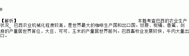 B 【解析】本题考查巴西的农业生产状况。巴西农业机械化程度较高,是世界最大的咖啡生产国和出口国。甘蔗、柑橘、香蕉、剑麻的产量居世界首位,大豆、可可、玉米的产量居世界前列。巴西畜牧业发展较快,牛肉大量出口。