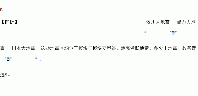 B 【解析】“汶川大地震”、“智力大地震”、“日本大地震”…这些地震区均位于板块与板块交界处,地壳活跃地带,多火山地震,故答案选B。